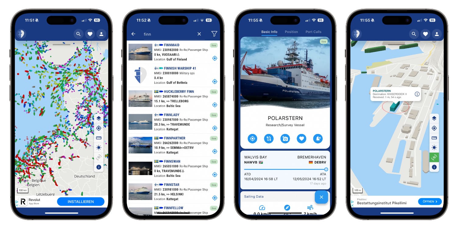 In wenigen Wochen beginnen in einigen Bundesländern wieder die Sommerferien, und damit auch die Reisezeit auf Fähren, Segelschiffen, Zeit in Häfen und am Strand, und mehr. Möchte man vor Ort schauen, welche Schiffe vor Anker liegen, wo sich die eigene Fähre gerade befindet, oder welcher Koloss am Horizont auf dem Meer entlang schippert, eignen sich Schiffstracker-Apps wie MyShipTracking (App Store-Link).