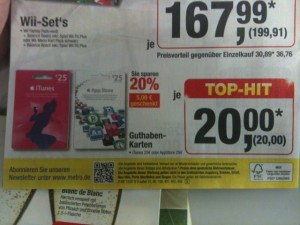 Reduziert sind iTunes- und App Store-Karten (nur unterschiedliche Designs) im Wert von 25 Euro, für die ihr nur 20 Euro bezahlen müsst. Achtung: Das Angebot gilt erst ab Donnerstag, dem 12. Juli 2012, läuft dann aber auch eine Woche bis zum 18. Juli.