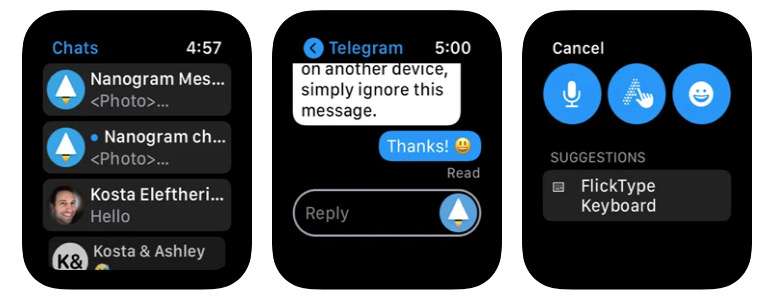 Der bekannte Entwickler Kosta Eleftheriou, der schon die Anwendung FlickType für die Apple Watch kreiert hat, wartet im deutschen App Store mit einer Neuerscheinung auf. Nanogram Messenger for Watch (App Store-Link) ist ein kostenloser Download, der sich auf der Apple Watch verwenden lässt und Nutzern bzw. Nutzerinnen des Messengers Telegram helfen soll, auch ohne ihr iPhone über die Smartwatch zu kommunizieren.