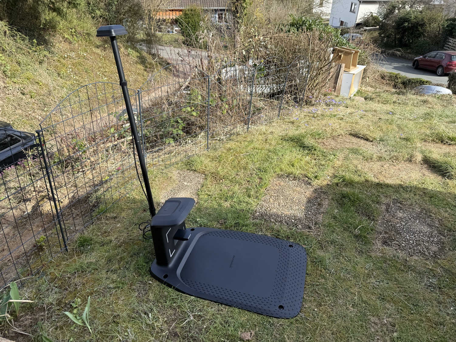 Während andere Mähroboter schon komplett auf Begrenzungsdrähte als auch RTK-Antennen verzichten, muss beim i105 eine Antenne aufgebaut werden. Da die Kabel wirklich lang sind, kann man die Antenne gut positionieren, im besten Fall so, dass sie freie Sicht nach oben hat, um einen bestmöglichen Empfang sicherzustellen. In der zugehörigen App gibt es bei der Installation immer wieder hilfreiche Hinweise, hier kann man wirklich nichts falsch machen.