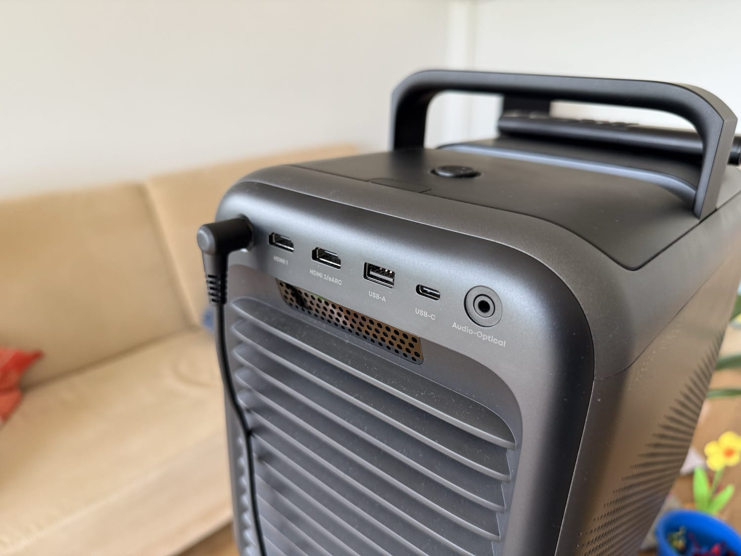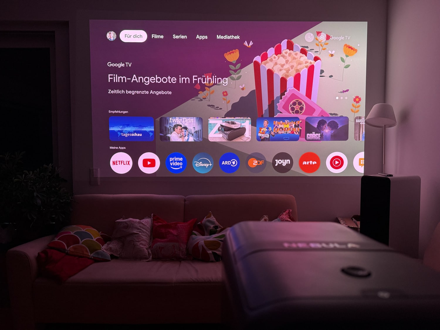 Der Aufbau ist kinderleicht, da man den Beamer lediglich mit dem Strom verbinden muss. Optional kann man via HDMI und HDMI/eARC auch externe Geräte anschließen, zum Beispiel Lautsprecher oder ein Apple TV. Obwohl ich mein Apple TV etwas vermisse, komme ich mit der Oberfläche von Google TV gut zurecht. Während mein alter Beamer vor allem kurz nach dem Start noch etwas hakelig war, gibt es beim High-End-Nebula keine Verzögerungen.
