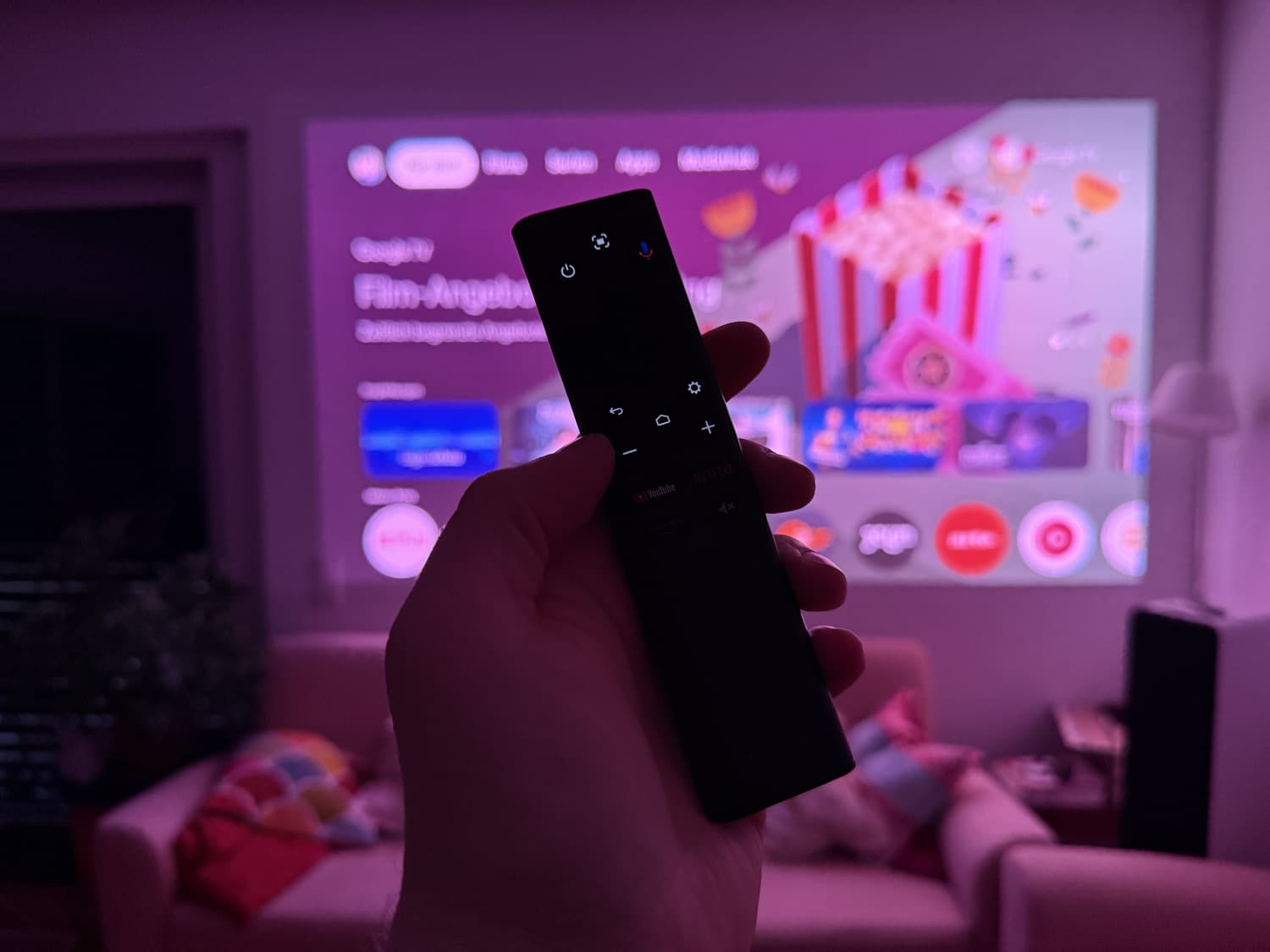 Meinen ersten Eindruck kann ich schnell und mit nur einem Wort zusammenfassen: Wow. Die Einrichtung von Google TV nimmt zwar ein paar Minuten in Anspruch und könnte einfacher sein, doch da hat Anker ja keinen Einfluss drauf. Der Beamer passt das Bild automatisch und perfekt an und ich war von der Größe schier erschlagen. Der optische Zoom kann eine Diagonale von bis zu 200 Zoll auf einer variablen Distanz von vier bis sieben Metern projizieren. Ganz so groß ist mein Bild nicht, aber ich bin einfach nur beeindruckt.