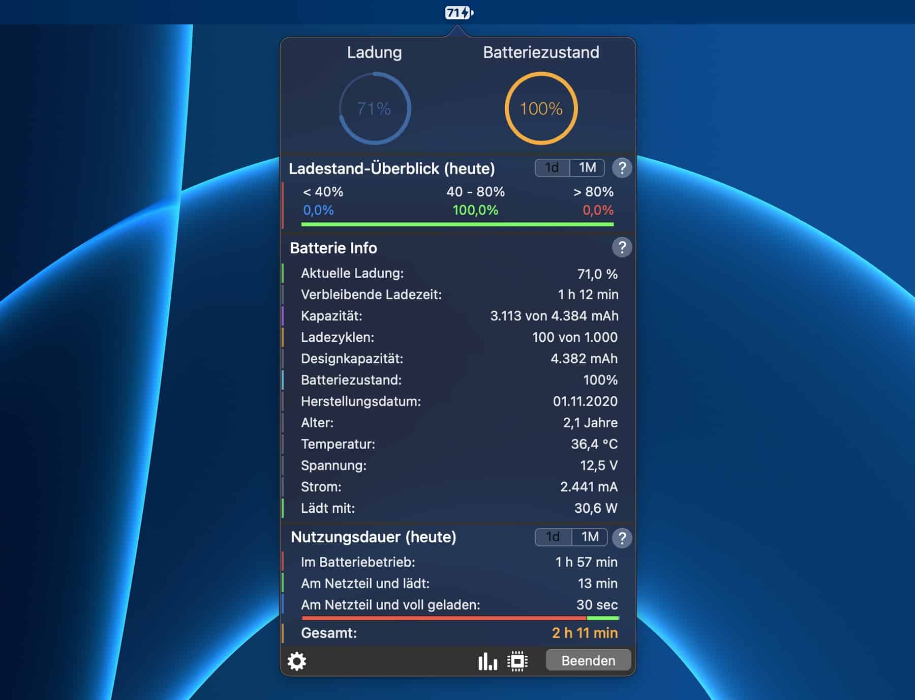 Auch Better Battery ist eine Menüleisten-App, die euch auf einen Blick mit den wichtigsten Daten versorgt. Dabei geht es aber nicht ums Wetter, sondern, wie der Name schon sagt, um die Batteriedaten eures Macs. Die App ermöglicht es euch, den Batteriezustand eures MacBooks immer im Auge zu behalten. Dabei wird nicht nur der Ladestand der Batterie angezeigt, sondern auch eine Aussage über die Batteriegesundheit getroffen. Auch Empfehlungen für die Nutzung des MacBooks per Batterie oder am Stromkabel gibt die App ab. In der kostenlosen Basisversion bekommt ihr einen Überblick über den aktuellen Ladestand des Akkus, die Restladezeit, die Akku-Kapazität, die Ladezyklen, Alter und Zustand der Batterie, deren Temperatur, elektrische Werte und Systeminformationen des Macs. Eine Übersicht der aktuellen MacBook-Modelle, die allesamt mit Better Battery 2 kompatibel sind, könnt ihr übrigens auch auf Seiten wie Testbericht.de finden, auch wir haben eine kleine News-Übersicht rund um Apples tragbare Computer für euch erstellt.