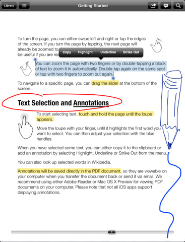 Man öffnet das PDF Dokument mit der App und kann mit verschiedenen Tools dieses bearbeiten. Wie der App Name schon sagt, kann man Textstellen hervorheben. Zudem kann man mit einem virtuellen Buntstift wichtige Passagen einkreisen oder kleine Bilder an den Rand malen. Wer ergänzende Informationen hinzufügen will kann einfach ein paar Text Notizen hinzufügen.