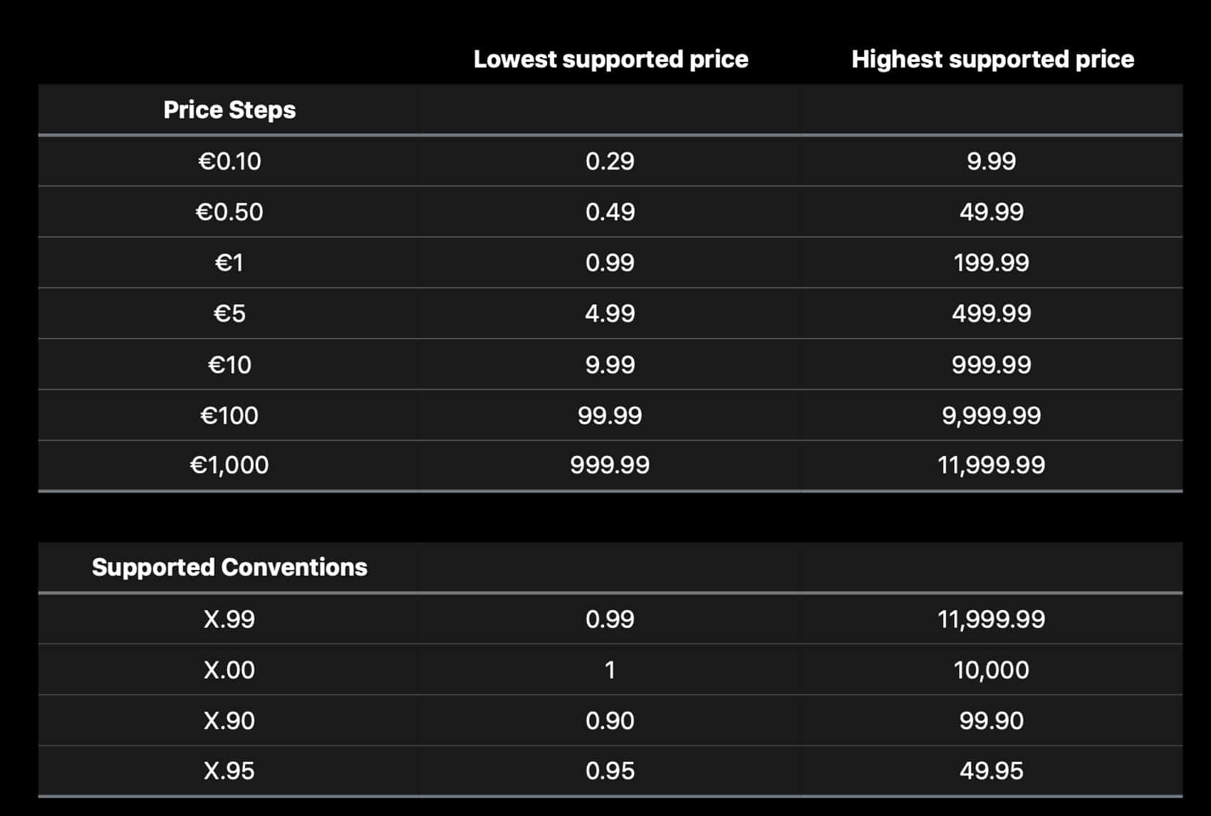 - 0,10 Euro Schritte für 0,29 Euro bis 9,99 Euro (zum Beispiel 1,09 Euro, 1,19 Euro, 1,29 Euro usw.)