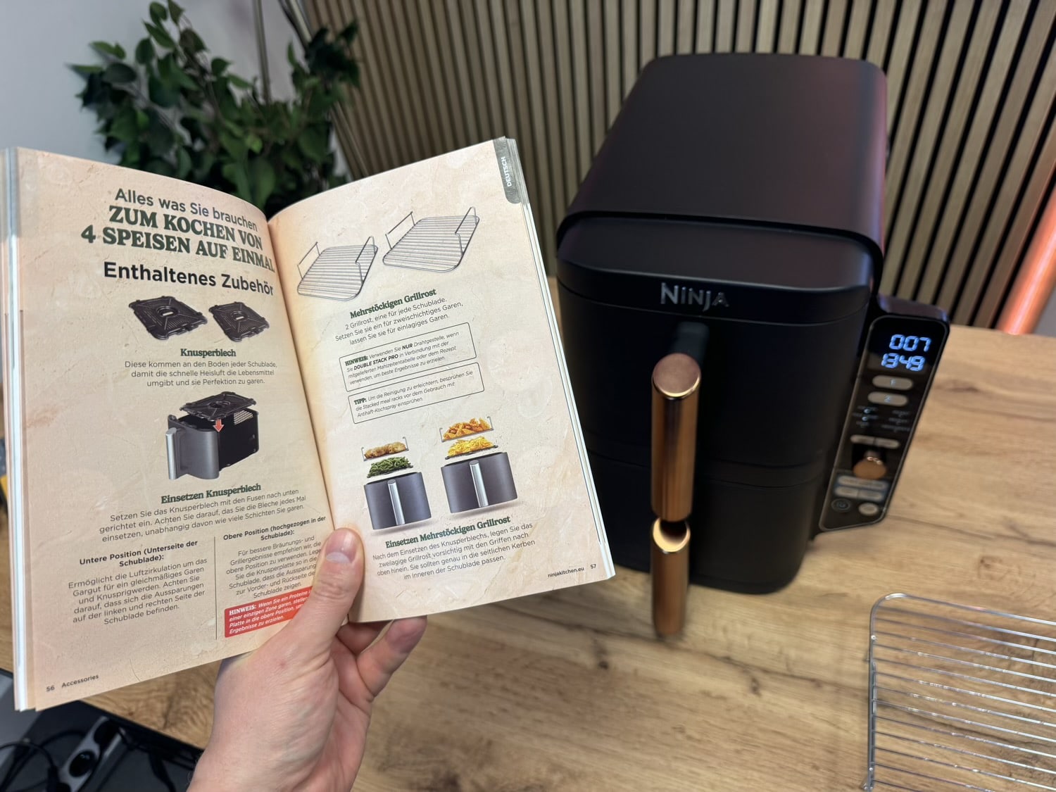 Darüber hinaus bietet Ninja einen wirklich tollen Quick Start Guide, ja fast schon ein kleines Rezeptbuch mit Erklärungen und ein paar Vorschlägen mit. Das gibt es definitiv nicht bei jedem Hersteller und dürfte vor allem für Neulinge auf dem Gebiet eine prima Sache sein. Hier wird wirklich im Detail und vor allem verständlich erklärt, wie der Ninja Double Stack XL funktioniert und genutzt werden kann.