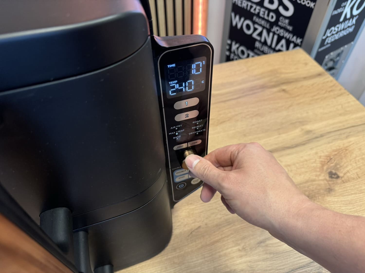 Das bringt uns an dieser Stelle direkt zum Bedienfeld des Ninja Double Stack XL. Ganz oben werden auf einem kleinen Display Zeit und Temperatur angezeigt, im Betrieb auch von beiden Etagen gleichzeitig. Darunter wählt man zunächst per Knopfdruck einen der beiden Körbe aus, dann per Drehrad den Modus. Und genau hier kommt eine Sache, die ich anders gelöst hätte.