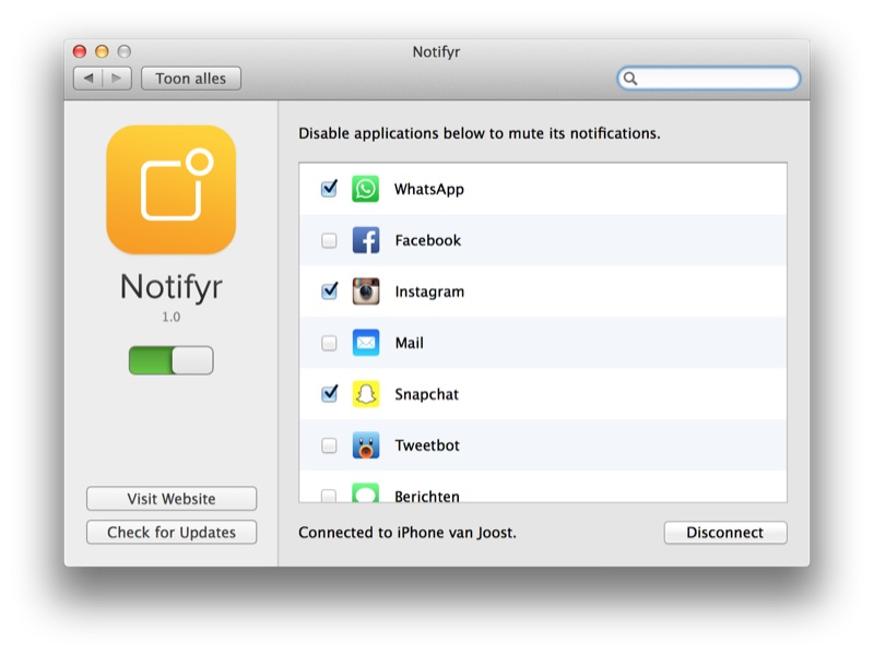 Praktisch ist die Tatsache, dass man innerhalb der Mac-Applikation bestimmte Benachrichtigungen innerhalb von Notifyr deaktivieren kann, sobald eine Push-Meldung empfangen wurden. Hilfreich ist das zum Beispiel bei Apps wie Mail oder iMessage, denn dort bekommt man die Nachrichten ja ohnehin schon auf den Desktop gebracht. Prinzipiell funktioniert Notifyr mit allen iPhone-Apps, die in der Mitteilungszentrale auftauchen können. Ebenfalls klasse: Solange man Notifyr auf dem iPhone nicht komplett beendet, wird die Verbindung zum Mac automatisch hergestellt, sobald man wieder in Reichweite ist.