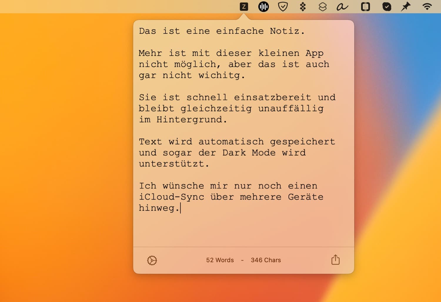Leider wurde die App seit zwei Jahren nicht mehr aktualisiert. Ich würde mir noch eine iCloud-Synchronisation wünschen, die es leider auch bei MenuBar Notez nicht gibt.