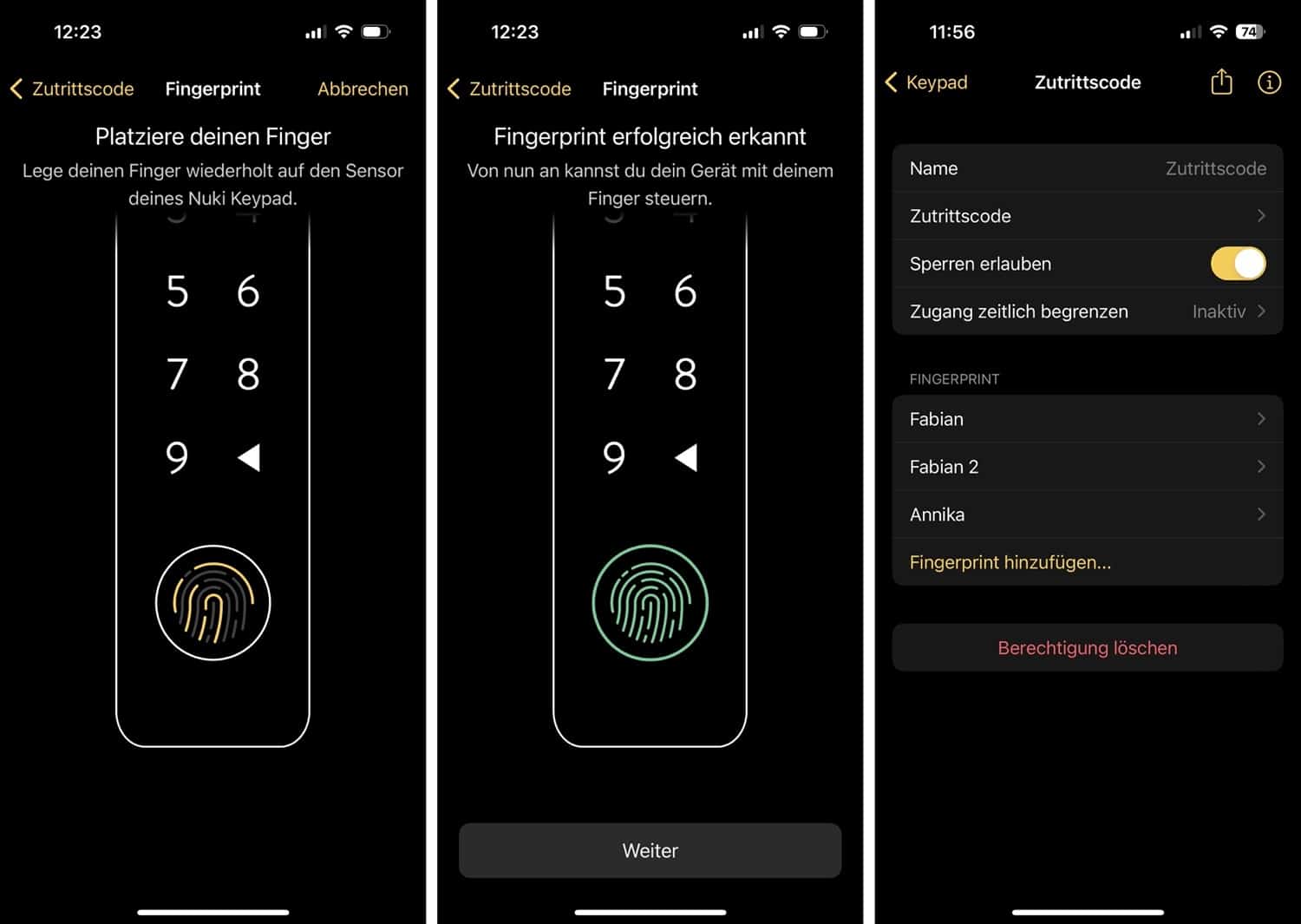 In der Nuki-App könnt ihr bis zu 20 Fingerabdrücke und 200 Zugangscodes einrichten, natürlich auch mit zeitlichen Beschränkungen. Wir haben beispielsweise die Finger unserer Eltern in der Nuki-App hinterlegt, so dass diese in mehr oder weniger großen Notfällen jederzeit ins Haus kommen. Für andere Personen gibt es einen Zugang per Code, den man auch mal eben von unterwegs aus erstellen kann, wenn das Nuki Smart Lock über einen Fernzugriff verfügt. Sämtliche Codes und Fingerabdrücke können auch jederzeit wieder in der App gelöscht werden.