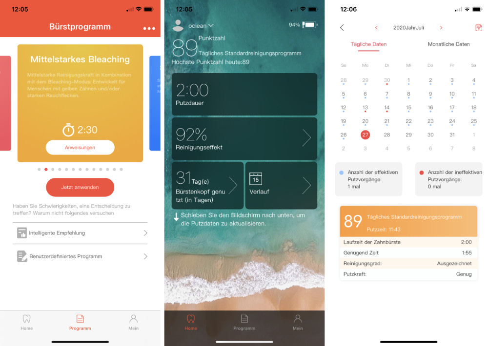 Zwar lässt sich die Oclean X Pro auch ohne ihre smarte Bluetooth 4.2-Verbindung nutzen, ihre volle Funktionalität erreicht sie allerdings erst in Kombination mit der oben bereits erwähnten iOS-App. Die Verbindung per Bluetooth ist schnell und zuverlässig eingerichtet, die Zahnbürste wurde in meinem Fall sofort von der App gefunden. Letztere aktualisiert dann auch die Anzeige auf dem Touchscreen mit entsprechenden Datums- und Uhrzeit-Infos, sammelt Putzdaten, hält einen Kalender zur Putzübersicht bereit, aktualisiert die Firmware, erlaubt das individuelle Einstellen von einem der 13 voreingestellten Putzprogramme und wertet die erfolgten Putzvorgänge hinsichtlich Reinigungseffekt, Laufzeit der Zahnbürste, Druck und Putzabdeckung aus.