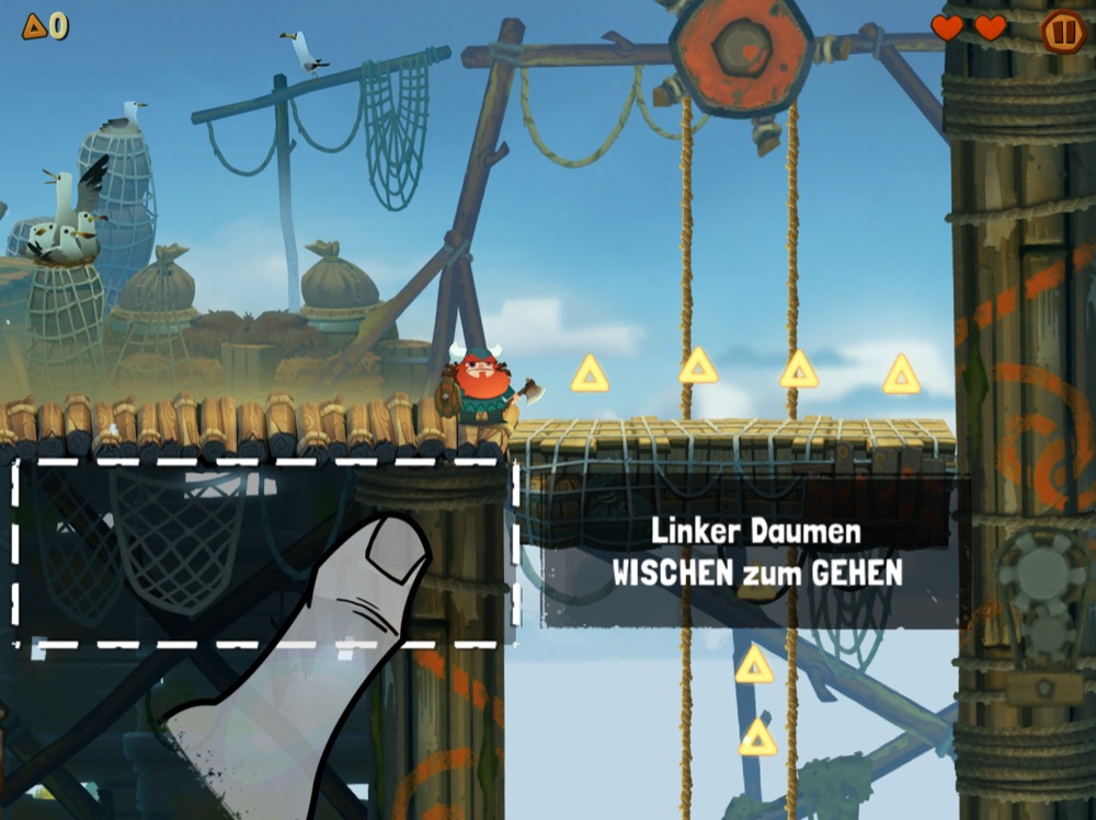 Die Steuerung erfolgt entweder per MFi-Gamecontroller oder ganz einfach mit dem Finger auf dem Display, gerade letzteres ist klasse gelöst: Mit dem linken Daumen steuert man Oddmar nach links und rechts, mit dem rechten Daumen lässt man den Wikinger springen und führt Angriffe mit dem Schwert oder später auch anderen Waffen durch.