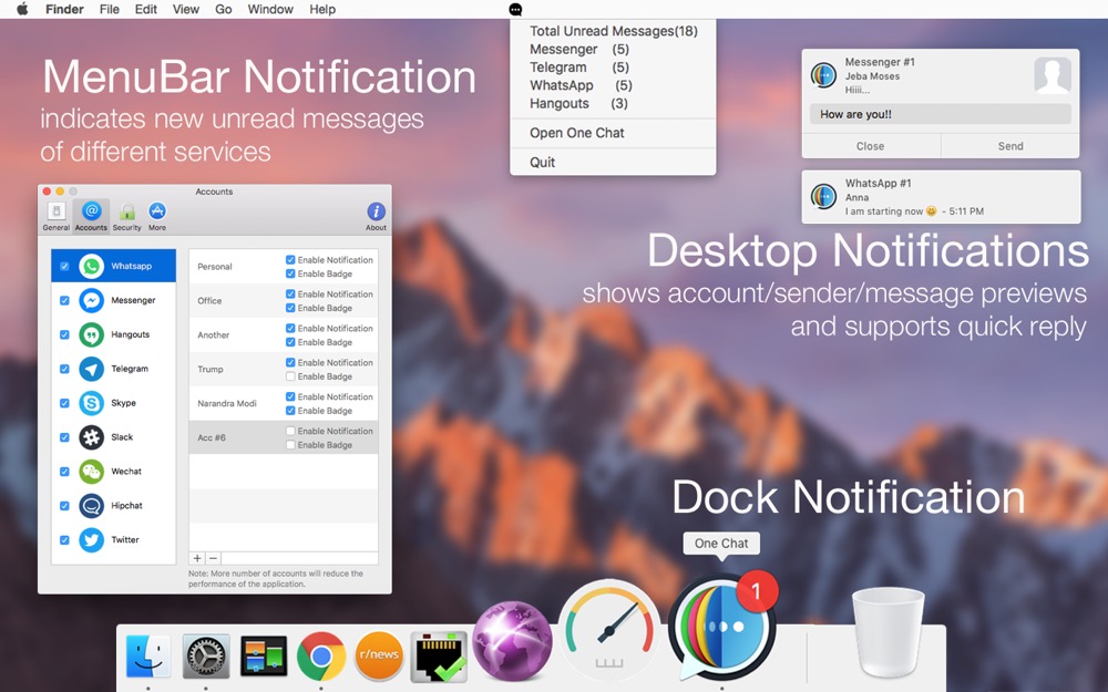 One Chat lässt sich dank kleiner 6,5 MB an Speicherplatzbedarf schnell und einfach auf alle Macs ab OS X 10.11 installieren und kommt zumindest in den einzelnen Messenger-Accounts mit einer deutschen Lokalisierung daher. Unterstützt werden gegenwärtig ganze 21 Messenger- und Netzwerk-Dienste: WhatsApp, Facebook Messenger, Google Hangouts, Telegram, Skype, Slack, WeChat, HipChat, Twitter, Yahoo, VKChat, ICQ, Discord, GroupMe, QQ, FBPage, Fleep, RocketChat, MySms, IRCChat und TweetDeck.