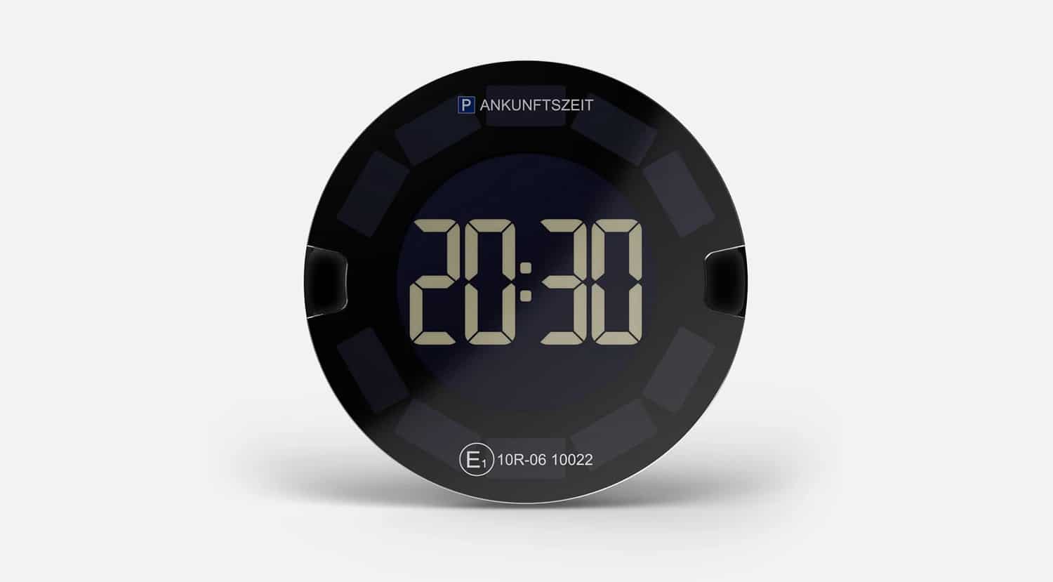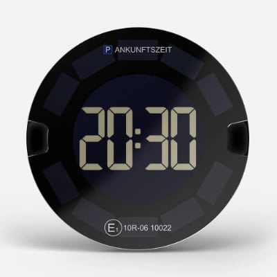 Das klassische runde Design bleibt erhalten, nun jedoch mit integrierten Solarzellen auf der Front. Mit nur 9,7 Millimetern ist die Ooono P-Disc No3 die bislang dünnste elektronische Parkscheibe. Datum und Uhrzeit sind bereits voreingestellt, sodass sie direkt einsatzbereit ist – eine Einrichtung ist nicht erforderlich. Die Parkscheibe erkennt automatisch, wenn das Fahrzeug abgestellt wird und stellt die passende Uhrzeit ein. Das kontrastreiche Display sorgt dafür, dass die Uhrzeit sowohl bei Sonnenlicht als auch in dunklen Parkhäusern gut lesbar bleibt.