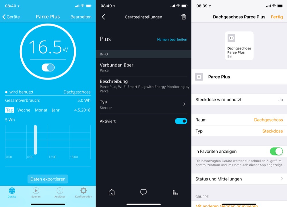 Wer Extra-Funktionen wünscht, kommt um die Installation der Parce-App nicht herum. Im besten Fall führt man hier gleich die Registrierung beim deutschen Anbieter durch, um dann auch wirklich alle Features nutzen zu können. Unter anderem liefert die Parce-App eine Verbrauchsanzeige, der Stromverbrauch kann zudem als CSV-Datei exportiert und dann in einer Tabellenkalkulation weiter verwendet werden.