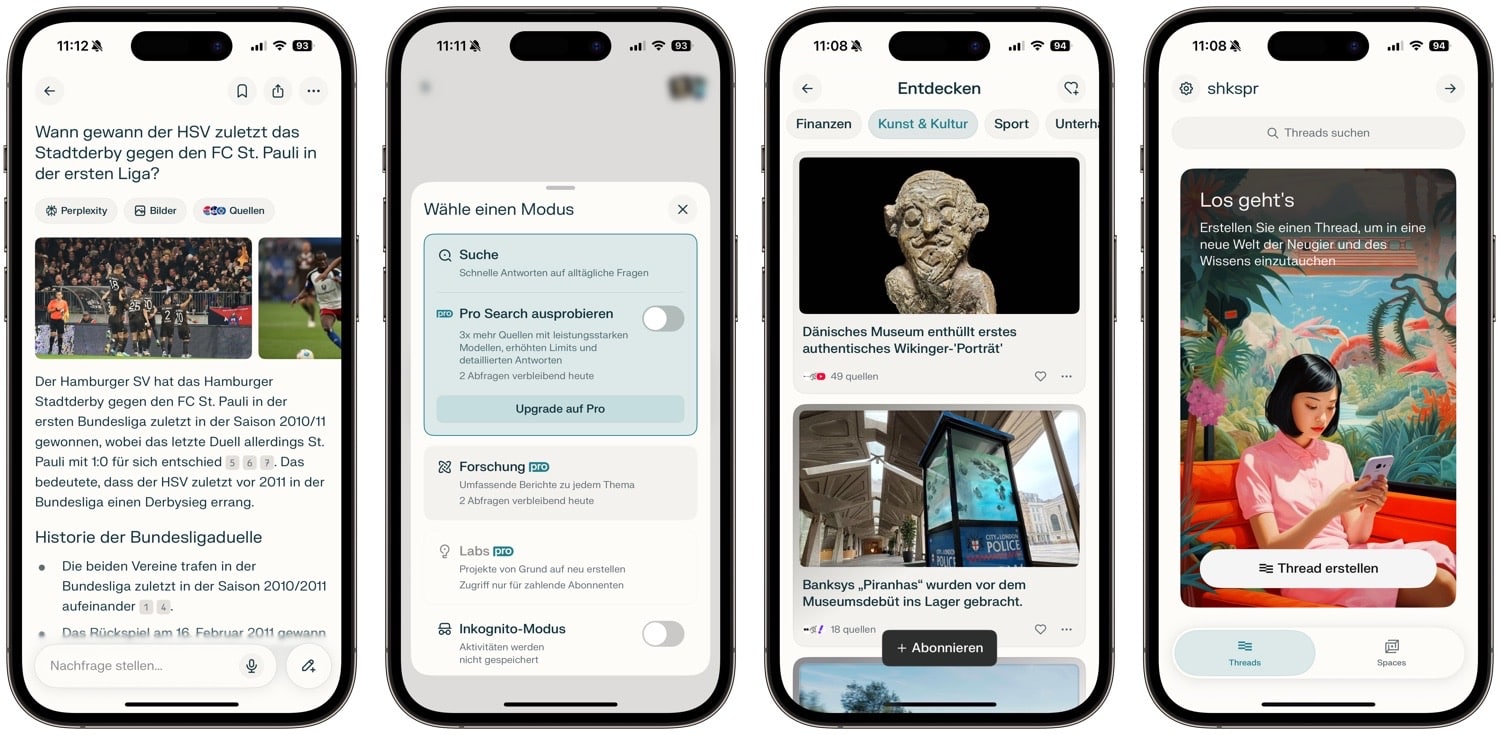 Perplexity für das iPhone steht weiterhin kostenlos im deutschen App Store zum Download bereit. Für letzteren sollte man neben 187 MB auch mindestens iOS 16.0 oder neuer auf dem iPhone bereitstellen. Auch eine deutsche Lokalisierung ist für die KI-App vorhanden. Wer zusätzliche Features und ein größeres Kontingent an Anfragen nutzen möchte, kann Perplexity Pro zu Preisen ab 22 Euro/Monat abonnieren. Im App Store bekommt die KI sehr gute 4,8 Sterne von den Nutzern und Nutzerinnen.