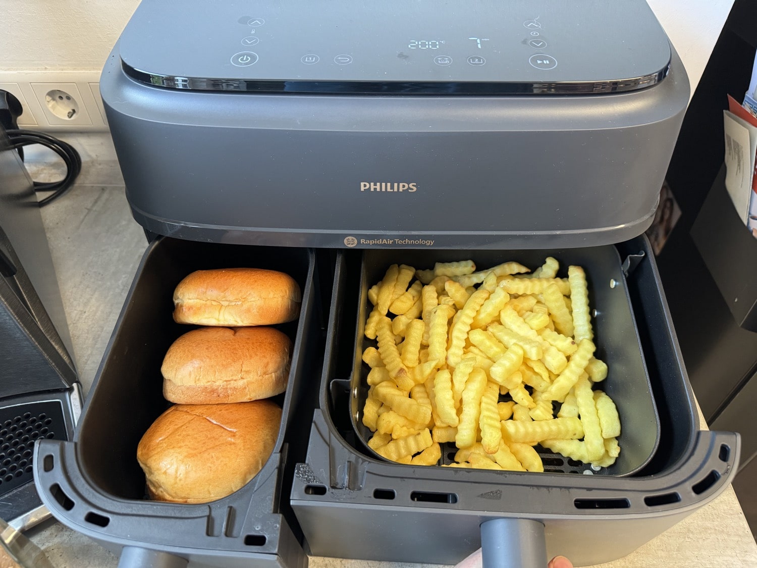 Der Philips Dual Basket Airfryer punktet mit zwei Körben und einem Fassungsvermögen von 3 und 6 Litern. Das kleine Fach ist eine prima Sache, um beispielsweise auch mal ein oder zwei Brötchen oder Laugenstangen aufzubacken. Dafür lohnt es sich ja nun wirklich nicht, den großen Backofen anzuschmeißen. Mein Tipp: Brötchen vom Vortag leicht anfeuchten und für 4 Minuten bei 155 Grad aufbacken. Dann schmecken sie wieder wie frisch vom Bäcker.
