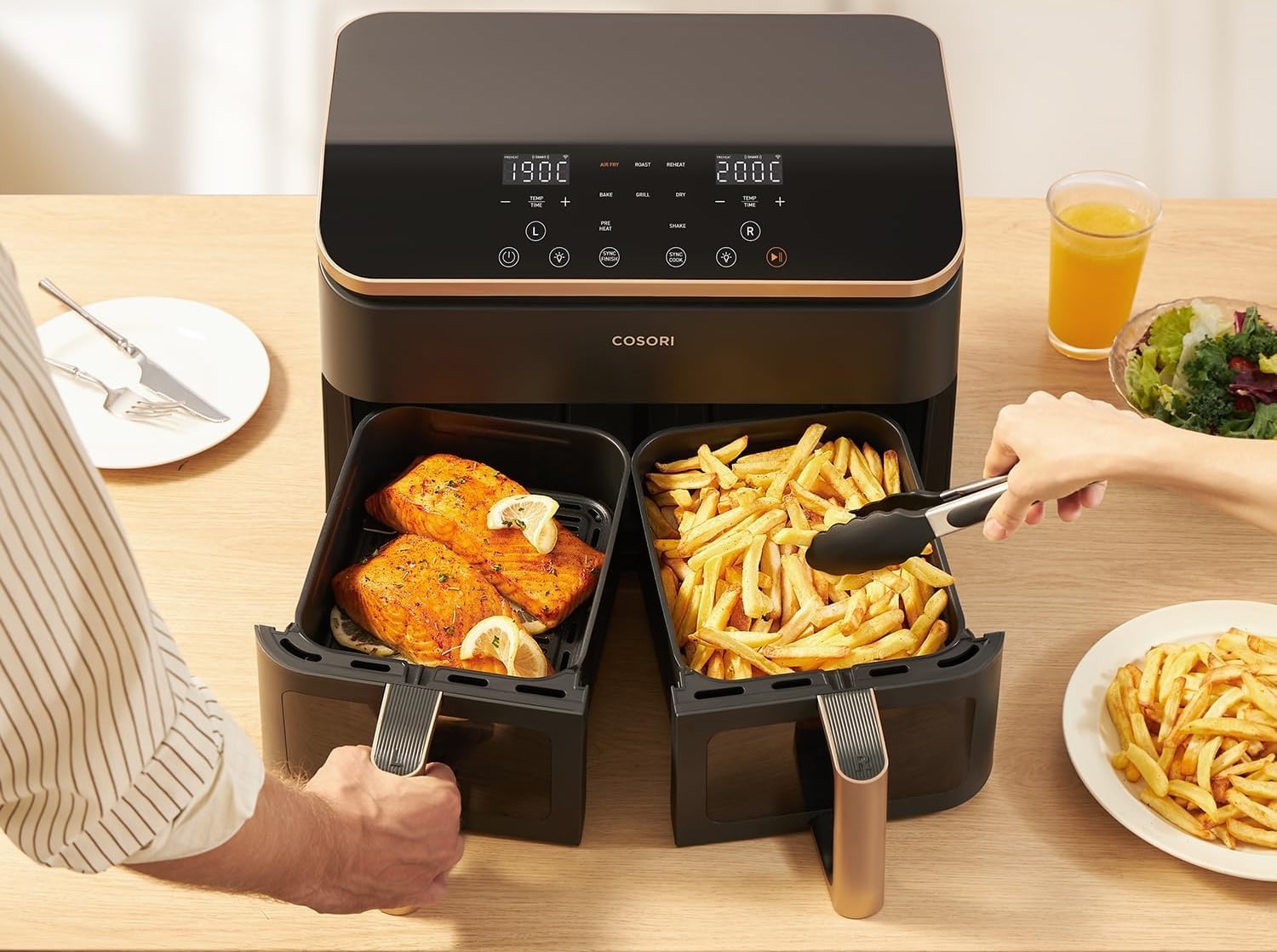 Nicht außer Acht lassen wollen wir die Cosori Heißluftfritteuse mit zwei Kammern, die bei der Stiftung Warentest sogar den Testsieg in ihrer Kategorie geholt hat. Dieser Airfryer fasst insgesamt 8,5 Liter, aufgeteilt in jeweils zwei gleich große Garkörbe mit je 4,25 Liter. Beide sind sogar mit einem Sichtfenster ausgestattet.