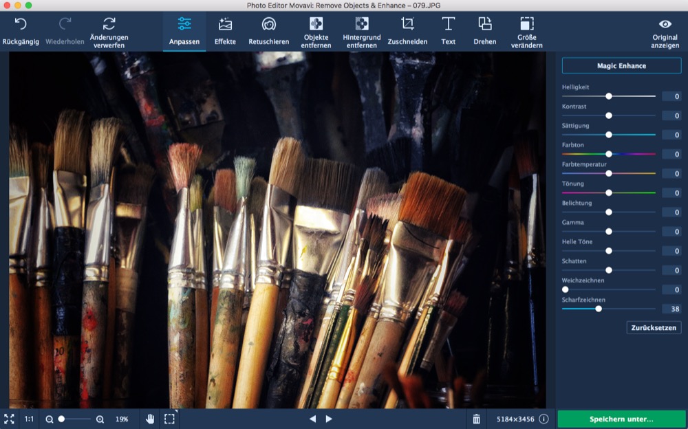 Das Hauptaugenmerk des Photo Editor Movavi liegt demnach auf der Retusche und Optimierung von eigenen Bildern. Dies wird auch gleich in der Hauptansicht der App deutlich, in der sich Reiter wie „Anpassen“, „Effekte“, „Retuschieren“, „Objekte entfernen“ und „Hintergrund entfernen“ finden.