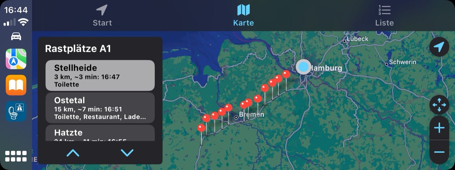 Richtig spannend finde ich die Tatsache, dass Place to Pee auch eine Unterstützung für CarPlay bietet. Schließlich sitzt nicht immer eine Person auf dem Beifahrersitz, die die Bedienung am iPhone übernehmen kann. Dank CarPlay kann Place to Pee auch einfach während der Fahrt bedient werden – wobei ohnehin nicht viele Aktionen notwendig sind, um das gewünschte Resultat anzuzeigen.