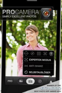 Wem die Funktionen der Standard-Kamera-App nicht ausreichen, sollte auf jeden Fall einen Blick auf ProCamera werden. Neben dem großen Konkurrenten Camera+ macht ProCamera eine wirklich gute Figur und zu einem Preis von 79 Cent ist das Angebot fast unschlagbar.