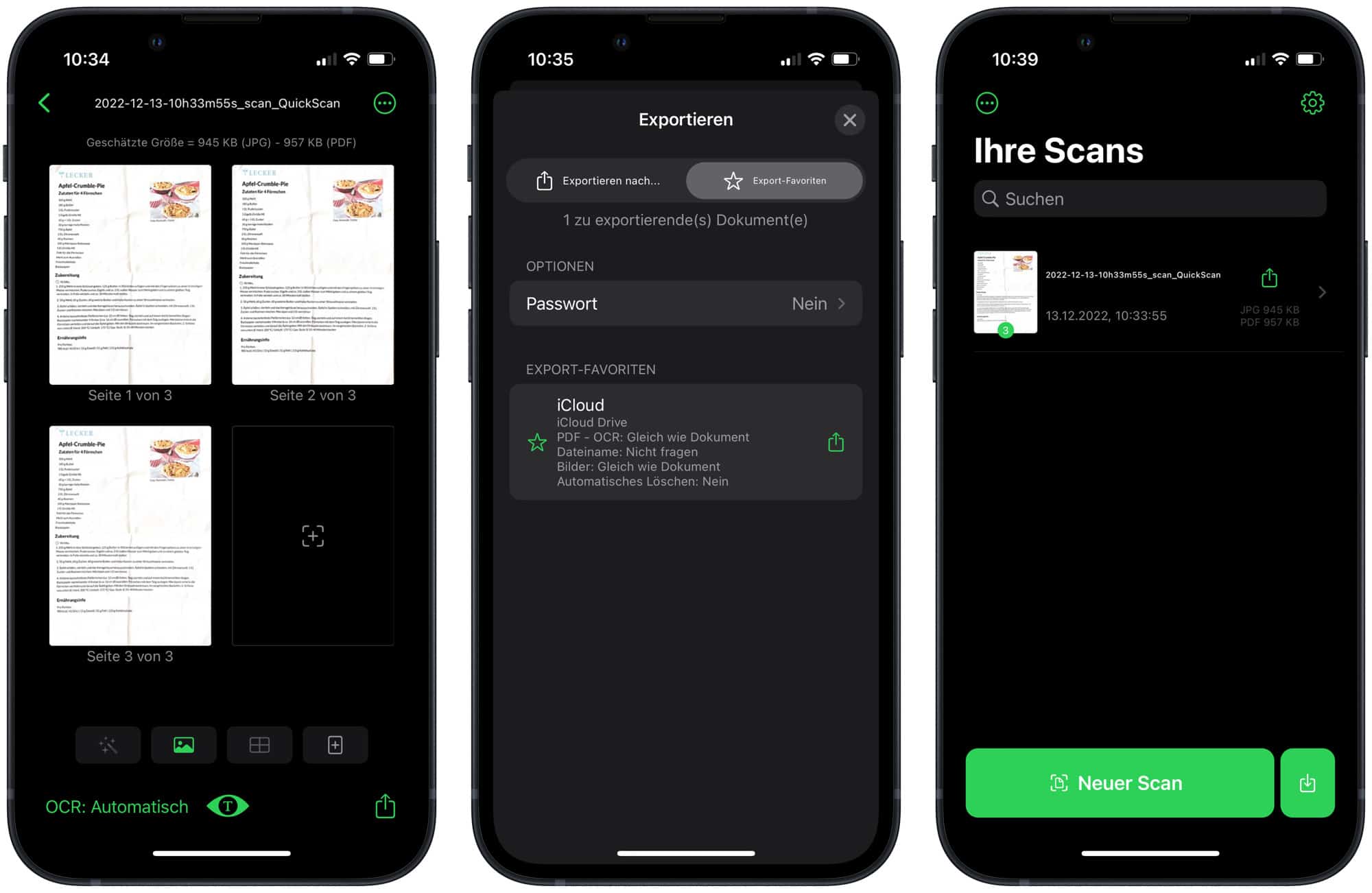 QuickScan ist ein wirklich praktisches Tool, das einfach in der Anwendung ist und qualitativ hochwertige Scans erstellt. Um ein neues Dokument zu scannen, öffne ich einfach die App und kann per Tippen auf „Neuer Scan“ direkt loslegen. Die App erkennt sofort, in welchem Bildausschnitt sich das zu scannende Dokument befindet und scannt dann auch nur dieses ein. So entfällt also auch mühsames Zuschneiden oder Geraderücken. Das Exportieren und auch das Anlegen von Exportfavoriten ist schnell gemacht. Zudem werden alle gescannten Dokumente in einer übersichtlichen Liste verwahrt, sodass ich das Exportieren bei Bedarf einfach wiederholen kann.