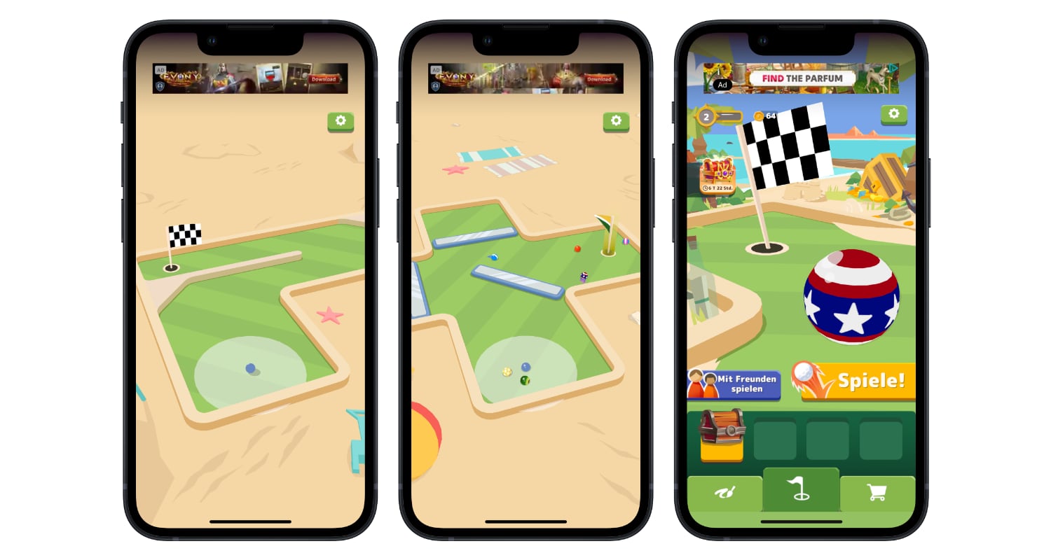 Pünktlich zum Start ins Wochenende habe ich heute das kleine Spiel Ready Set Golf (App-Store-Link) für euch, in dem ihr euer Minigolf-Talent unter Beweis stellen könnt – und zwar sowohl im Single-Player-Modus als auch gemeinsam mit Freunden oder Spielern aus der ganzen Welt. Euch erwarten über 100 bunte Minigolfbahnen und ein schnelles Gameplay, allerdings auch diverse Werbeanzeigen und In-App-Käufe.