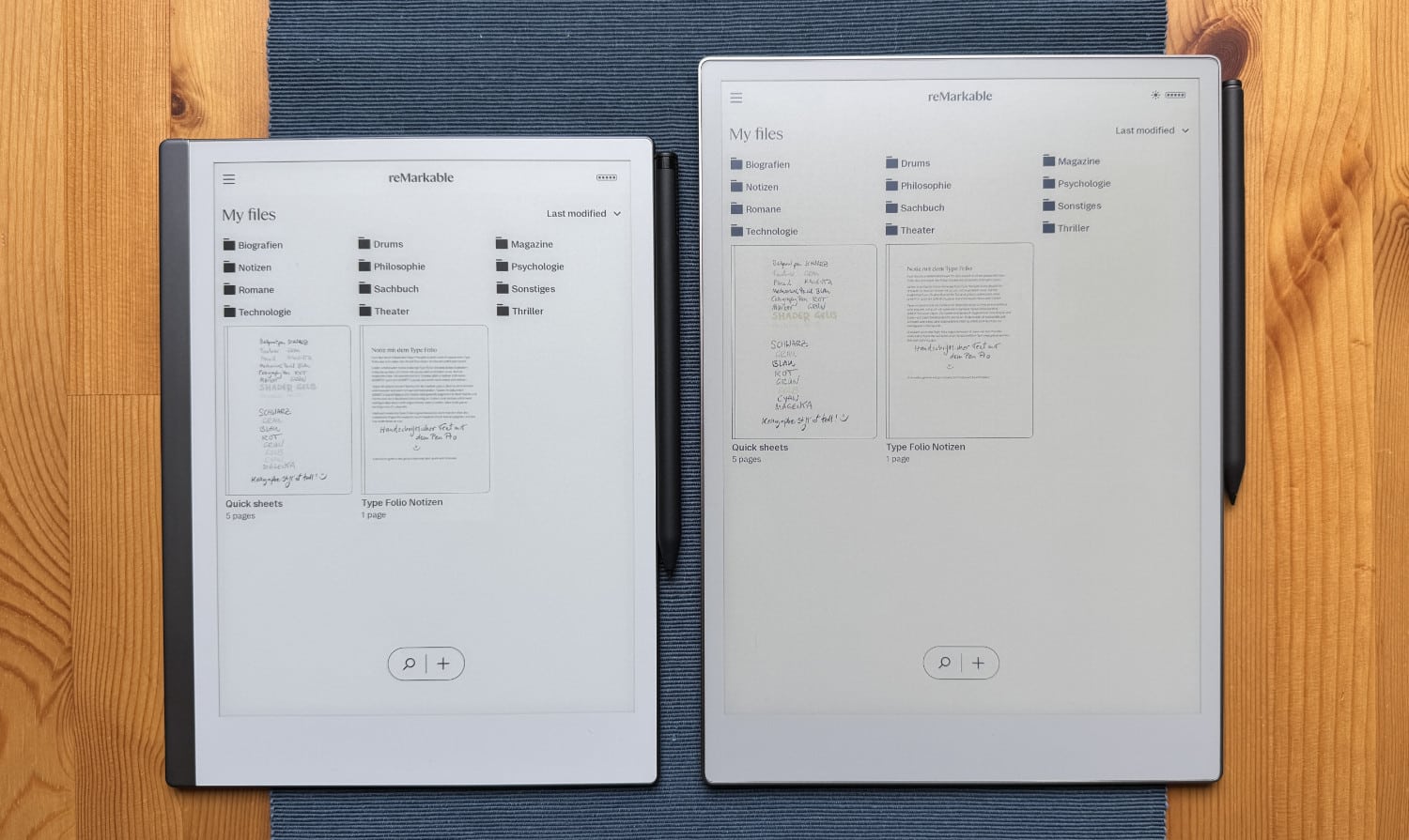 Auch wenn sowohl beim reMarkable 2 als auch beim Paper Pro ein Canvas-Display zum Einsatz kommt, machen sich die verschiedenen Display-Technologien bemerkbar. Das reMarkable 2 mit seinem Schwarz-Weiß-Display setzt auf ein klassisches E-Ink-Display mit sehr guter Lesbarkeit auch bei Sonnenlicht und guten Schwarzwerten. Beim reMarkable Paper Pro bewegen sich farbige Tintenpartikel innerhalb des Displays, um das Geschriebene und Gelesene wiederzugeben. Auf diese Weise sollen die Farben das Gefühl einer gedruckten Zeitungsseite vermitteln.