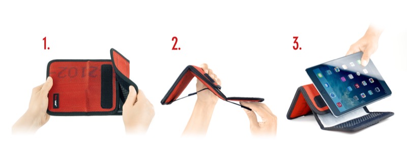 Rob kann aber noch mehr: Hat man das iPad aus der Hülle genommen, kann auf der Rückseite an einem Band gezogen werden. So wird Rob quasi zusammengestaucht und dient als Aussteller für das iPad. Dank einer gummierten Auflagefläche und einem kleinen Stopper steht das Tablet sicher, egal ob es im Quer- oder Hochformat aufgestellt wird. Das ist in der Tat erstaunlich, denn eigentlich macht die Konstruktion einen relativ wackeligen Eindruck.