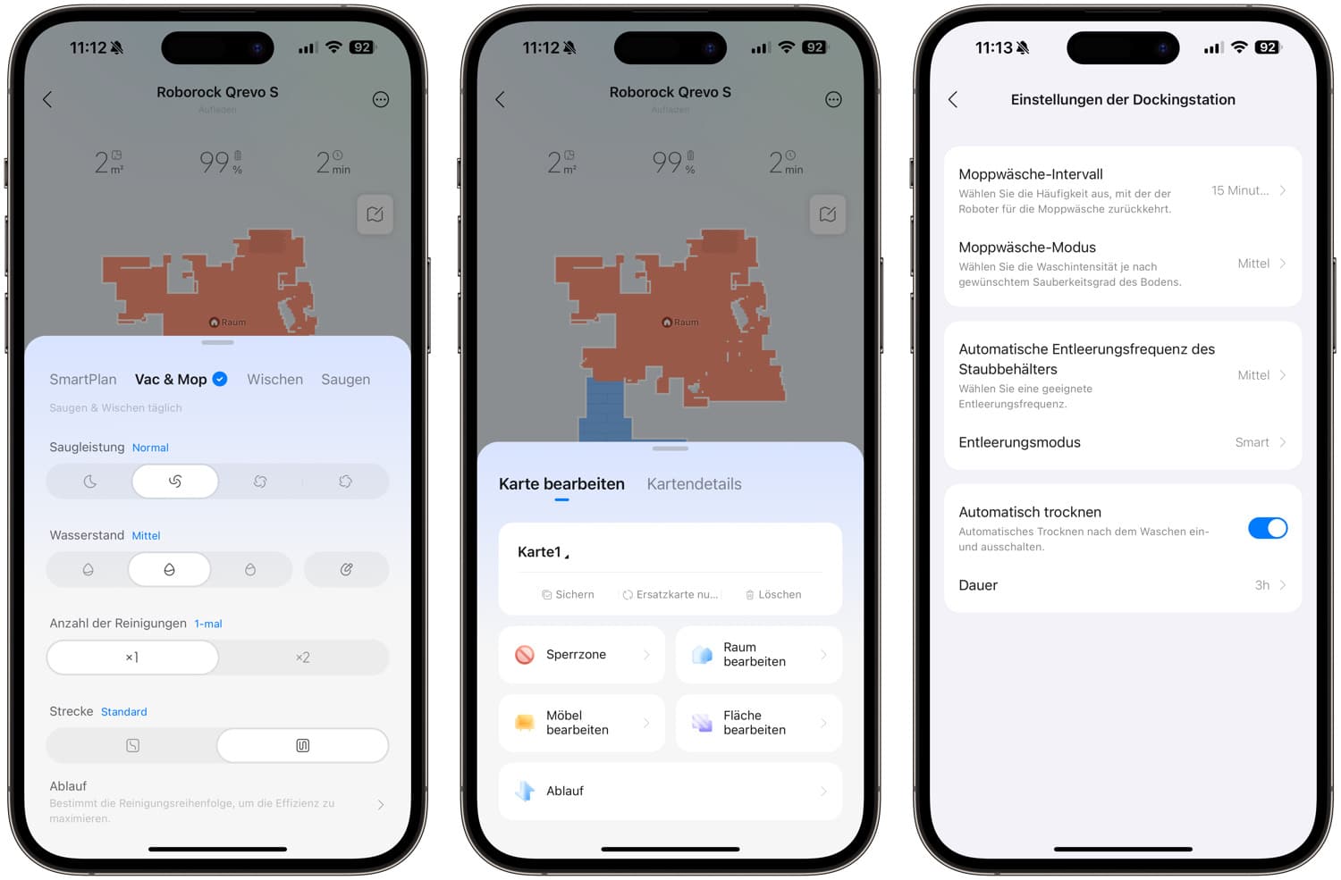 Die Steuerung und alle Einstellungen könnt ihr in der Roborock-App vornehmen, die ich weiterhin als sehr benutzerfreundlich einstufe. Alles ist gut erklärt und natürlich sind alle Beschriftungen auf Deutsch verfügbar. Innerhalb der App könnt ihr die Karte einsehen, NoGo-Zonen bestimmen, Räume benennen, zwischen verschiedenen Ansichten wechseln, mehrere Karten verwalten, die Saug- und Wischstufe einstellen, den Wasserdurchfluss bestimmen, den Teppich-Boost aktivieren, die Einstellungen der Basisstation anpassen und vieles mehr.