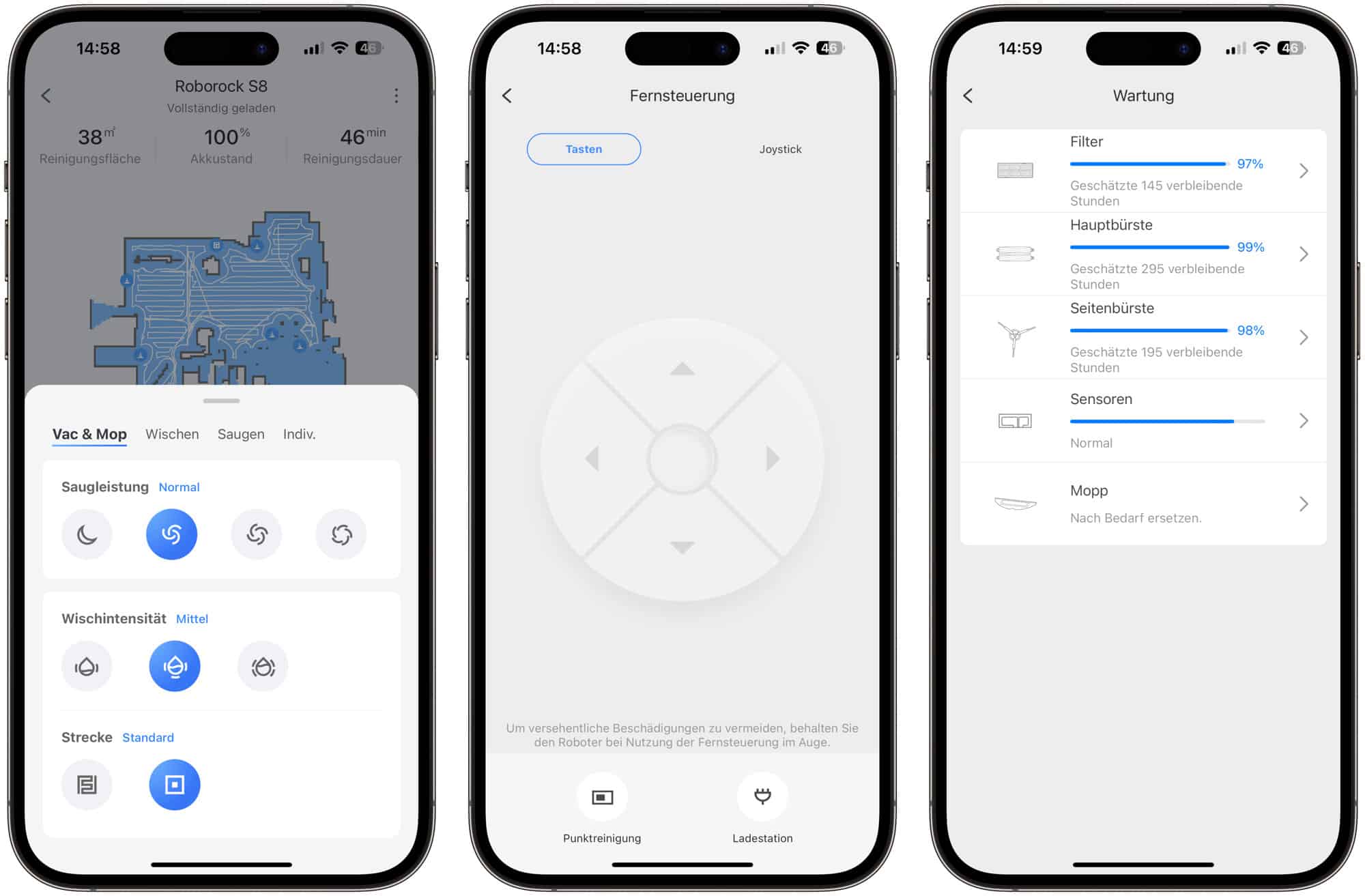 Im Reinigungsverlauf seht ihr alle Arbeitsvorgänge des Roboters, im Bereich Wartung wird die geschätzte Restlebensdauer von Filter, Bürste und Sensoren angegeben. Hier gilt es dann Sensoren zu reinigen oder Filter auszutauschen. Firmware-Updates stehen per App selbstverständlich mit wenigen Klicks bereit.