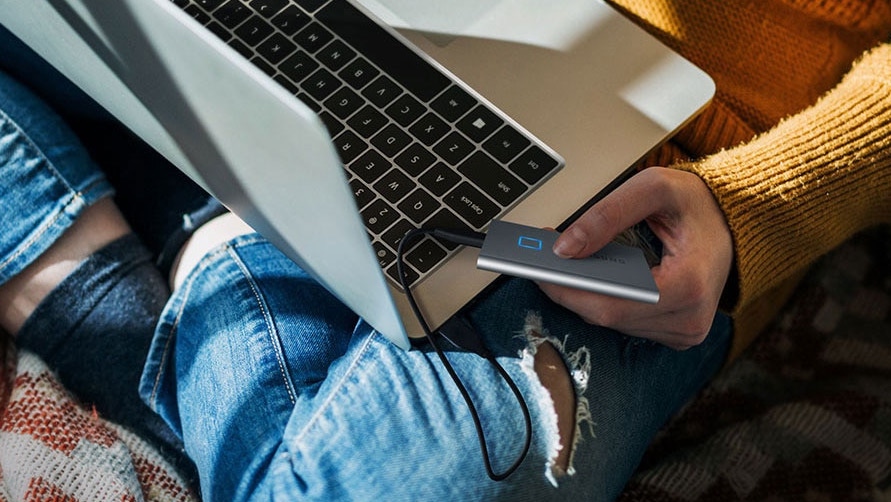 Ein besonderes Extra ist der Fingerabdruckscanner. Auf Basis der AES-256-Bit-Hardwareverschlüsselung ist nicht nur der Schutz durch ein Kennwort möglich – auf Wunsch lassen sich zusätzlich bis zu vier Fingerabdrücke registrieren, um Sicherheit und Komfort zu gewährleisten. Die SSD T7 Touch setzt, anders als noch die Vorgängerserie Portable SSD T5, auf NVMe- statt SATA-Technologie und liefert im Vergleich nahezu doppelte Übertragungsraten.
