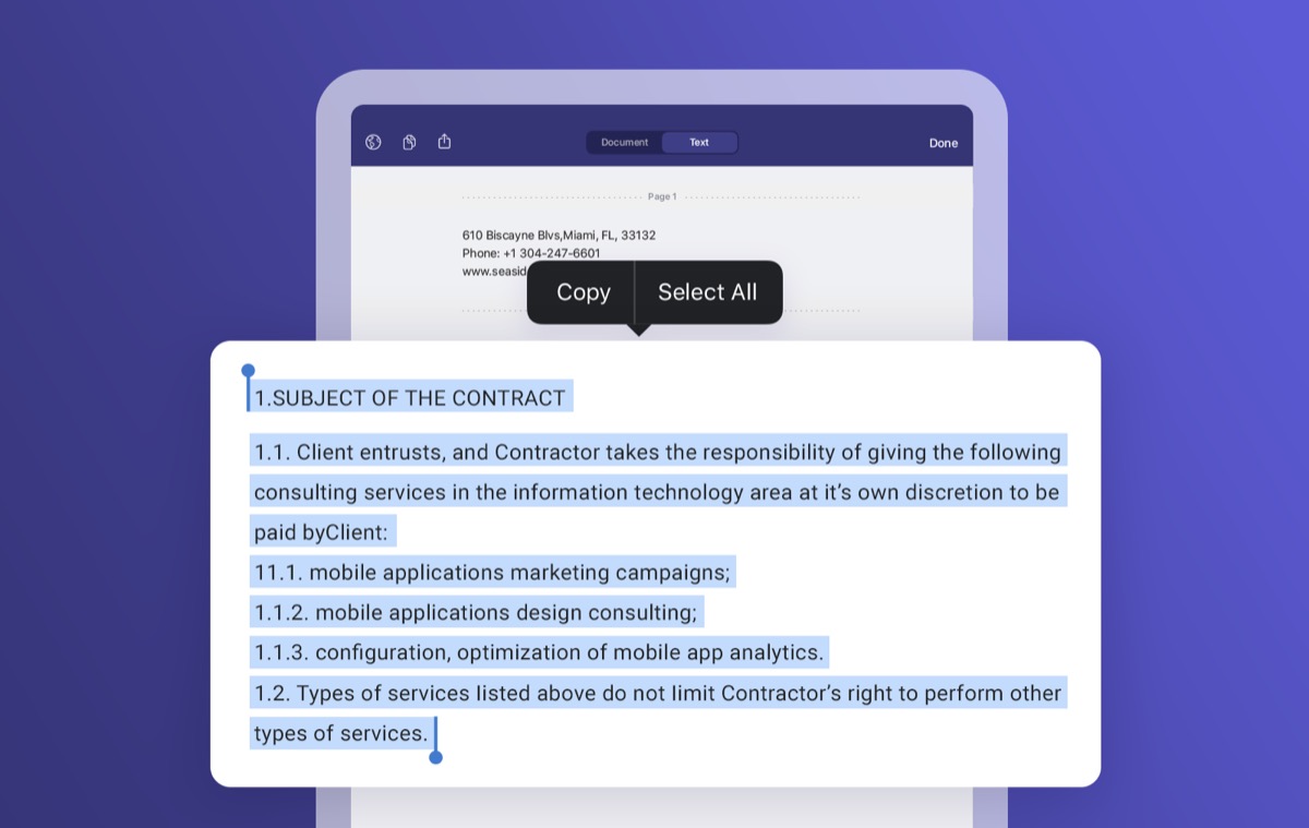 Mit Text Vision erkennt Scanner Pro automatisch die Texte Ihrer Scans in 26 Sprachen, so dass diese durchsuchbar und auswählbar sind. Auf diese Weise können Sie problemlos einen Absatz aus einem Lehrbuch an Ihre Notizenapplikation weitergeben oder beliebige Namen oder Zahlen aus gescannten Belegen kopieren.