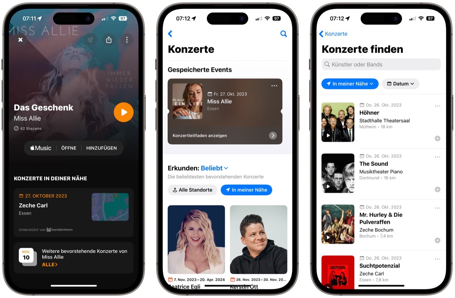 Über die Startseite von Shazam gelangt ihr aber auch direkt in den neuen Konzerte-Bereich. Dort werden euch passende Konzerte zu euren letzten Shazam-Suchen angezeigt. Ebenfalls könnt ihr aber eine integrierte Suche nutzen, um Konzerte in ganz Deutschland und in eurer Nähe zu entdecken.