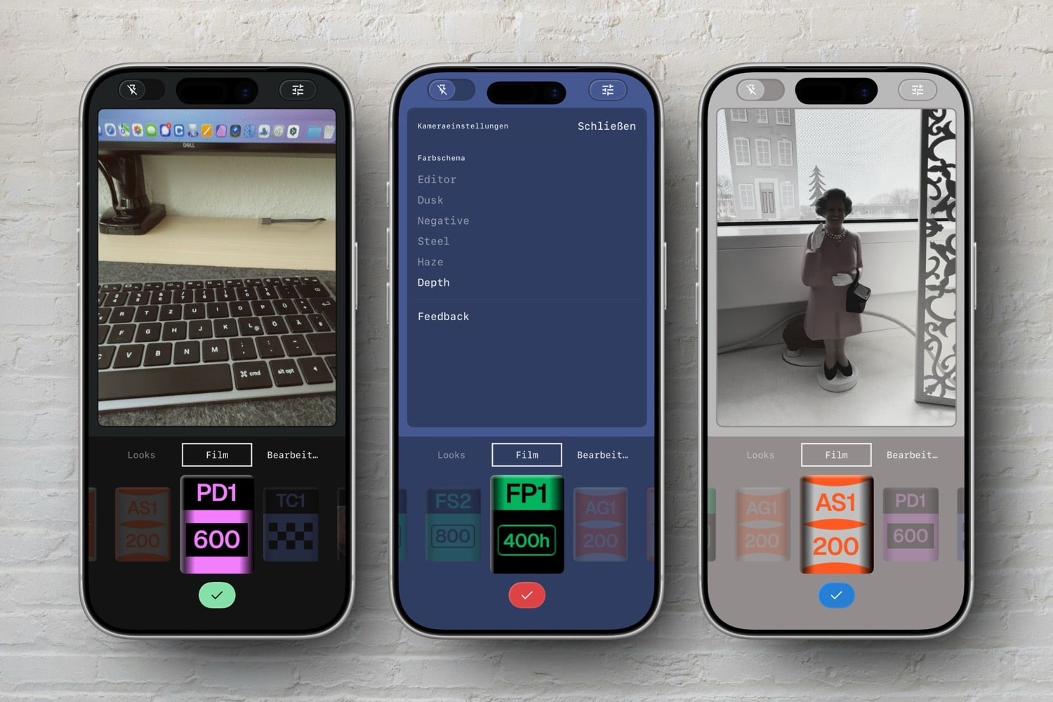 Der Kamerasucher ist eher skeuomorphisch und verfügt über eine Rückspul-Tastenanimation, wenn man den Film wechselt. Durch Tippen auf das Einstellungssymbol in der oberen rechten Ecke lässt sich aus sechs Farbthemen wählen: Editor, Dusk, Negative, Steel, Haze und Depth. Die Blitzsteuerung befindet sich auf der linken Seite. Der Sucher rendert den Stil und die Stärke, aber die Körnung wird erst nach der Aufnahme angewendet.