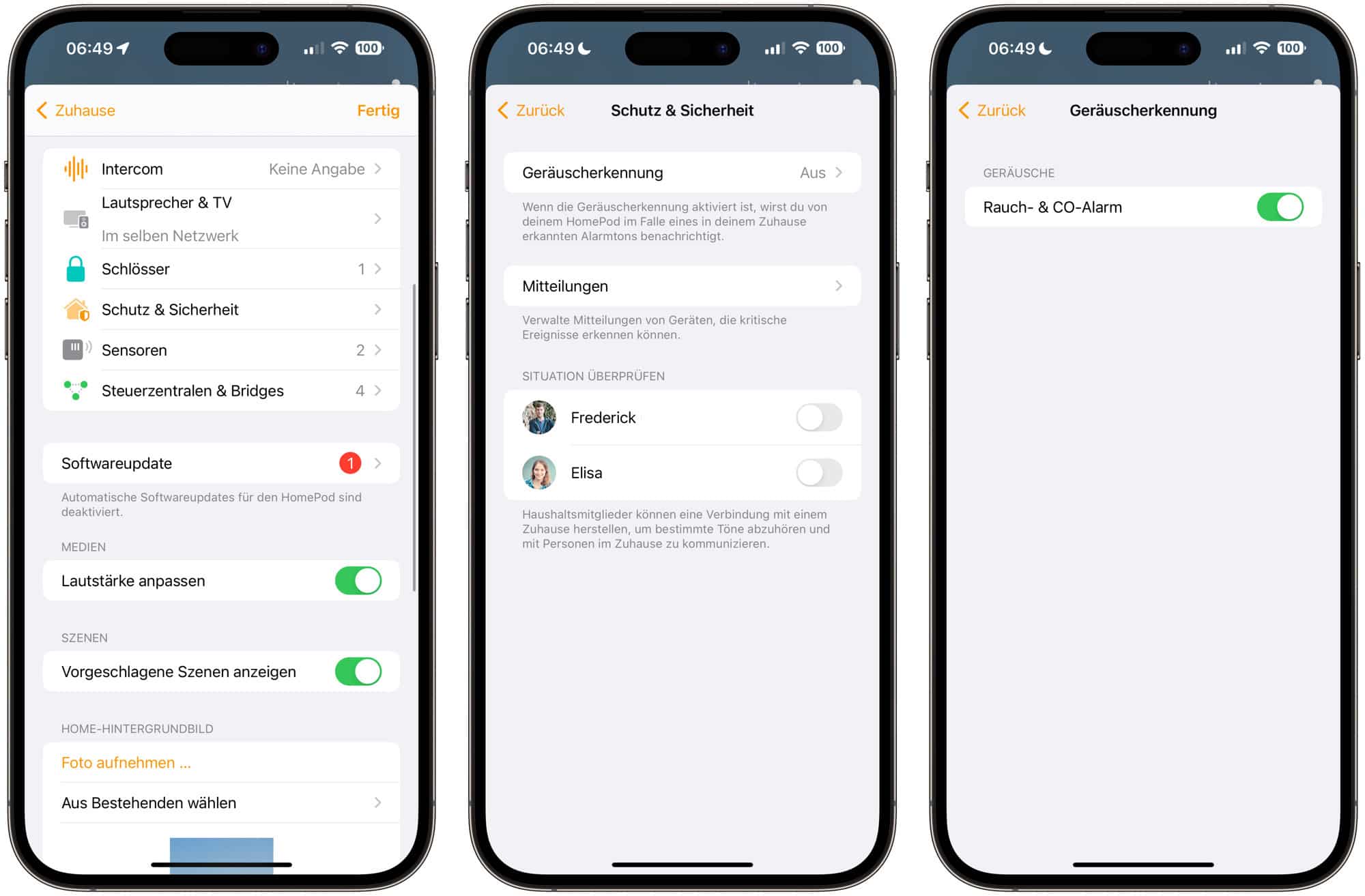 Mit der Geräuscherkennung kann der HomePod auf Rauch- und Kohlenmonoxidalarme reagieren und eine Benachrichtigung direkt an das iPhone der im Haushalt lebenden Personen senden, wenn ein Geräusch erkannt worden ist. Natürlich gibt es schon smarte Rauchmelder, über diesen Umweg können aber auch klassische Rauchmelder etwas smart werden.