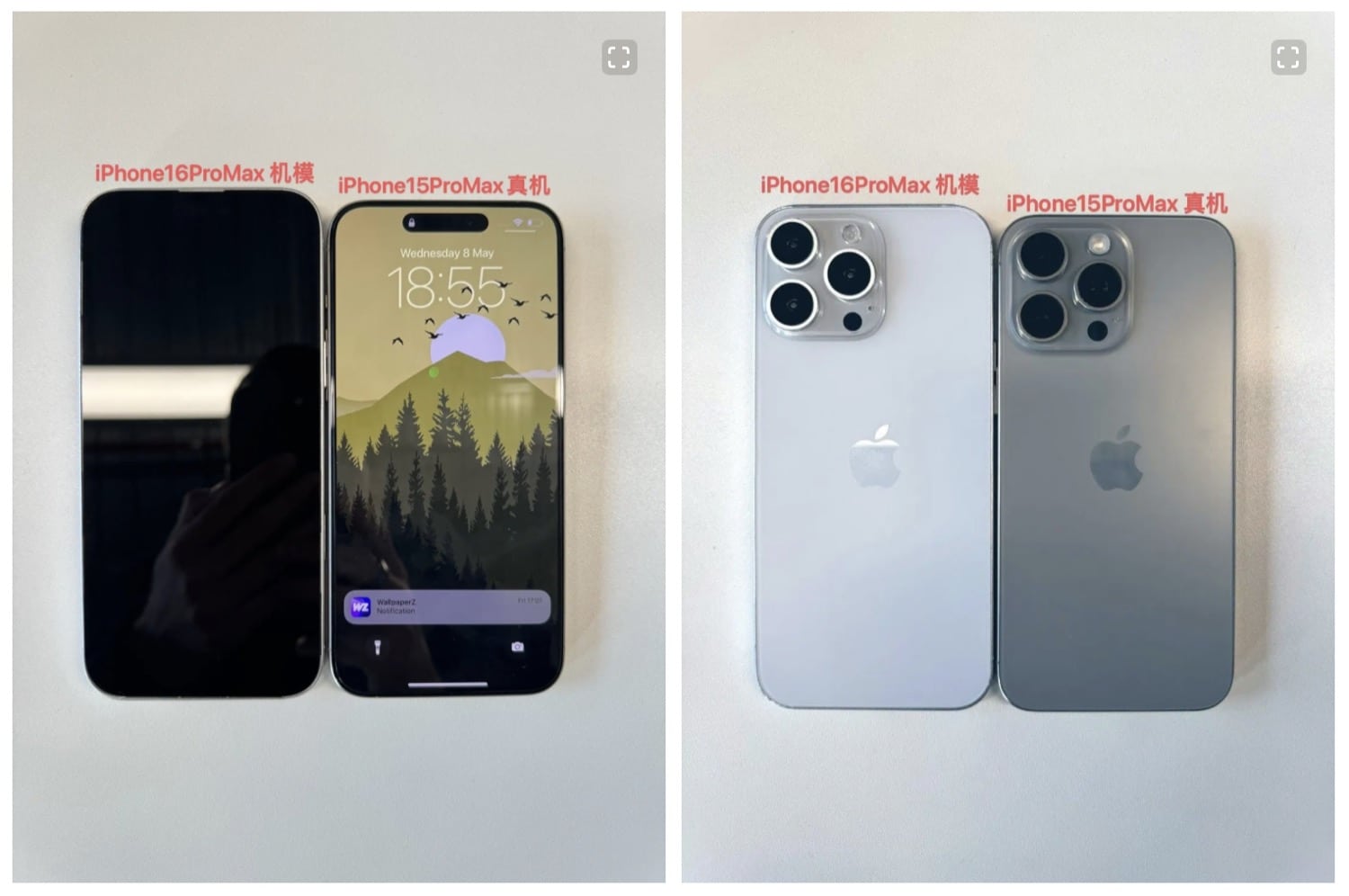 Ein Twitter-Nutzer hat einfach mal ein aktuelles iPhone 15 Pro Max neben einen Dummy des iPhone 16 Pro Max gelegt – und das Ergebnis im Foto festgehalten.