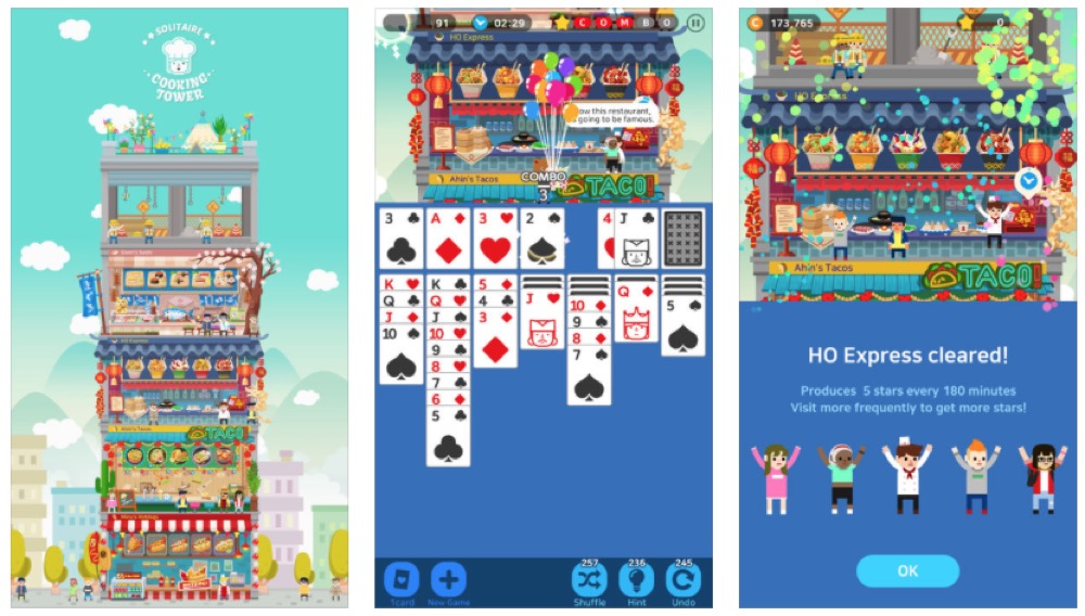 Das Team von Sticky Hands hat mit Solitaire Cooking Tower ein spezielles Kartenspiel im Solitär-Stil herausgegeben: „Baue deine eigenen Restaurants, während du dein Lieblings-Solitär spielst“, heißt es daher auch in der App Store-Beschreibung. Gespielt wird im klassischen Klondike-Stil, bei dem eine Karte pro Zug vom Stapel aufgedeckt wird.