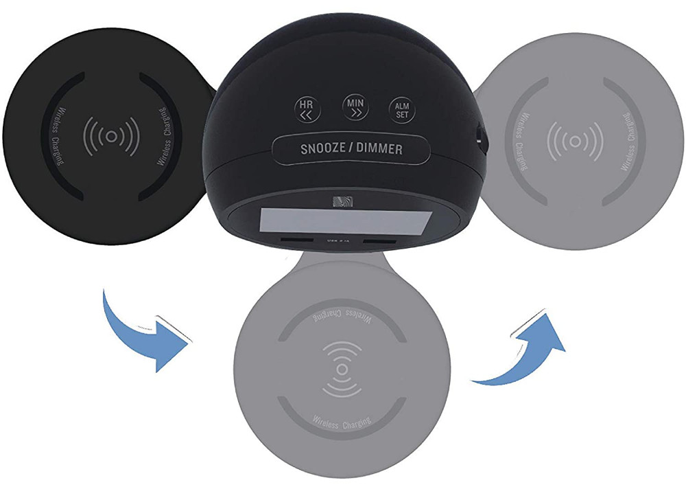 Um für jede Nachtkonsole geeignet zu sein, kann das runde Wecker-Element um bis zu 180 Grad gedreht werden, so dass sich die Qi-Ladefläche entweder links, rechts oder direkt vor dem Weckermodul befindet. An der Vorderseite des Weckers befinden sich außerdem zwei weitere USB-Ladeports mit 1A für Smartphones und 2.1A für Tablets bzw. andere stromhungrigere Geräte. Am Boden des Weckers gibt es zudem ein Fach für eine CR2032-Knopfzelle, die als Backup-Batterie sorgt, falls einmal der Strom ausfällt oder das Gerät vom Netzteil genommen wird – so bleiben die Einstellungen bestehen. Auf der Rückseite befinden sich außerdem Buttons zum erneuten Einrichten von Uhrzeit und Datum sowie ein Schalter, um automatisch zwischen Sommer- und Winterzeit wechseln zu können. So muss die Uhrzeit nicht jedes Mal komplett neu eingestellt werden.