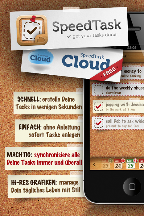 Natürlich kannst du dich an Aufgaben erinnern lassen durch den integrierten Push-Dienst. Zudem kannst du deine Aufgaben mit drei visuell unterschiedlichen Wichtigkeitsstufen anlegen. Über die kostenlose SpeedTask Cloud kannst du deine Termine automatisch synchronisieren lassen. Der Vorteil: Ist man einmal registiert, kann man von jedem internetfähigen Gerät seine Aufgaben aus dem Webbroswer heraus verwalten.