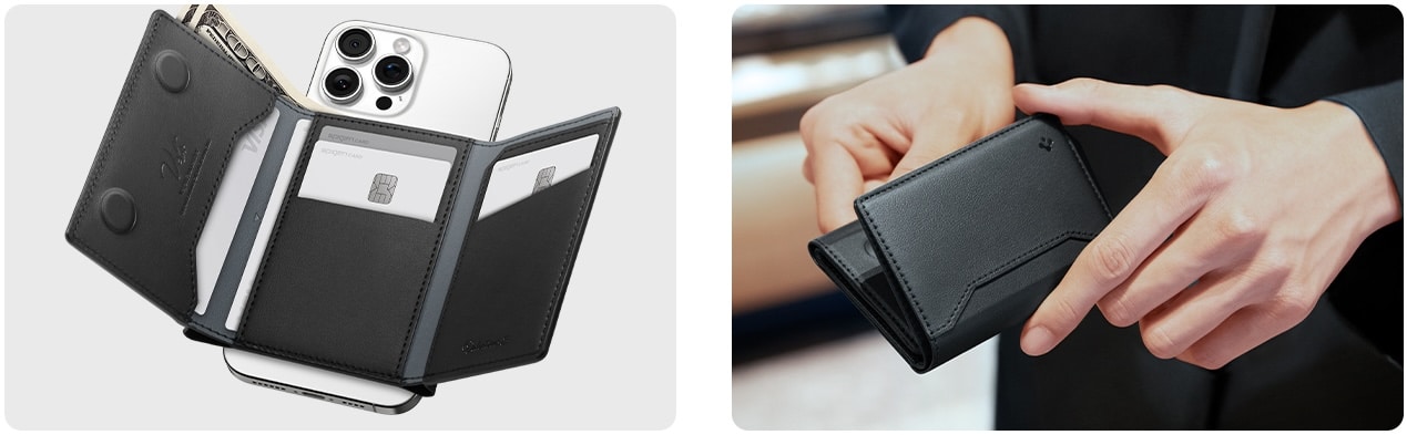 Hergestellt ist das Spigen Valentinus S aus veganem Velo-Faux-Leder. Außerdem kann man das Wallet nutzen, um das iPhone im Hoch- oder Querformat aufzustellen. Die Brieftasche selbst wird mit Magneten geschlossen, zudem gibt es einen RFID-Schutz. Optional könnt ihr die MagSafe-Brieftasche auch ohne das iPhone nutzen. Wenn ihr ohne iPhone das Haus verlasst, könnt ihr das Wallet einfach abnehmen und in die Hosentasche stecken.
