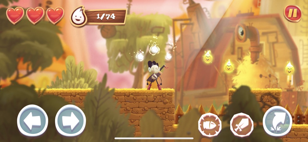 Das Gameplay besteht aus klassischen Platformer-Elementen zum Springen, Ausweichen, Klettern und Einsammeln von kleinen Seelen-Boni. Glücklicherweise gibt es dazwischen auch immer wieder kleine Checkpoints, so dass es bei den nicht immer ganz einfach zu bewältigenden Geschicklichkeits-Abschnitten nach dem Ableben nicht komplett von neuem losgehen muss. Gesteuert wird der Protagonist in Spirit Roots übrigens mit Hilfe von On-Screen-Buttons zum Vorwärts- und Rückwärtsbewegen, zum Springen, Attackieren und Schießen. Wer möchte, kann den Platformer auch mit einem kompatiblen MFi-Controller absolvieren.