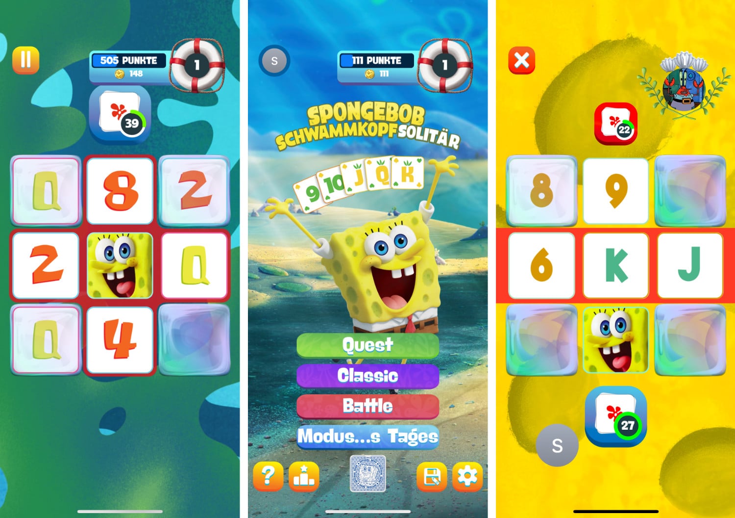 Spielen lässt sich SpongeBob Solitär in insgesamt drei Modi: Im Questmodus, in Mehrspieler-Battles und in einem klassischen Modus. Dabei kommen auch verschiedenste Kartendecks, die sich sammeln lassen, zum Einsatz. Gespielt wird übrigens auf einem quadratischen Spielfeld. „Wie man spielt, lernst du im Handumdrehen, aber du musst strategische vorgehen, um alle Karten abzulegen“, heißt es zum Gameplay auch im App Store.