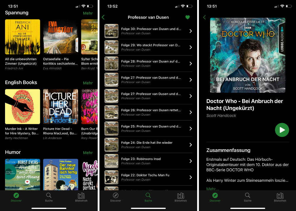 Auch wenn es vielen Nutzern von Musik-Streaming-Diensten nicht bekannt ist: Die Portale bieten oft auch viele Hörbücher und Hörspiele im Sortiment an. Mit der kostenlosen App Lismio (App Store-Link) für iPhone und iPad kommt man ihnen auf die Schliche. Die Universal-App ist etwa 12 MB groß und benötigt zudem iOS 13.5 oder neuer auf dem Gerät. Zudem steht auch bereits eine deutsche Lokalisierung für Spooks bereit.