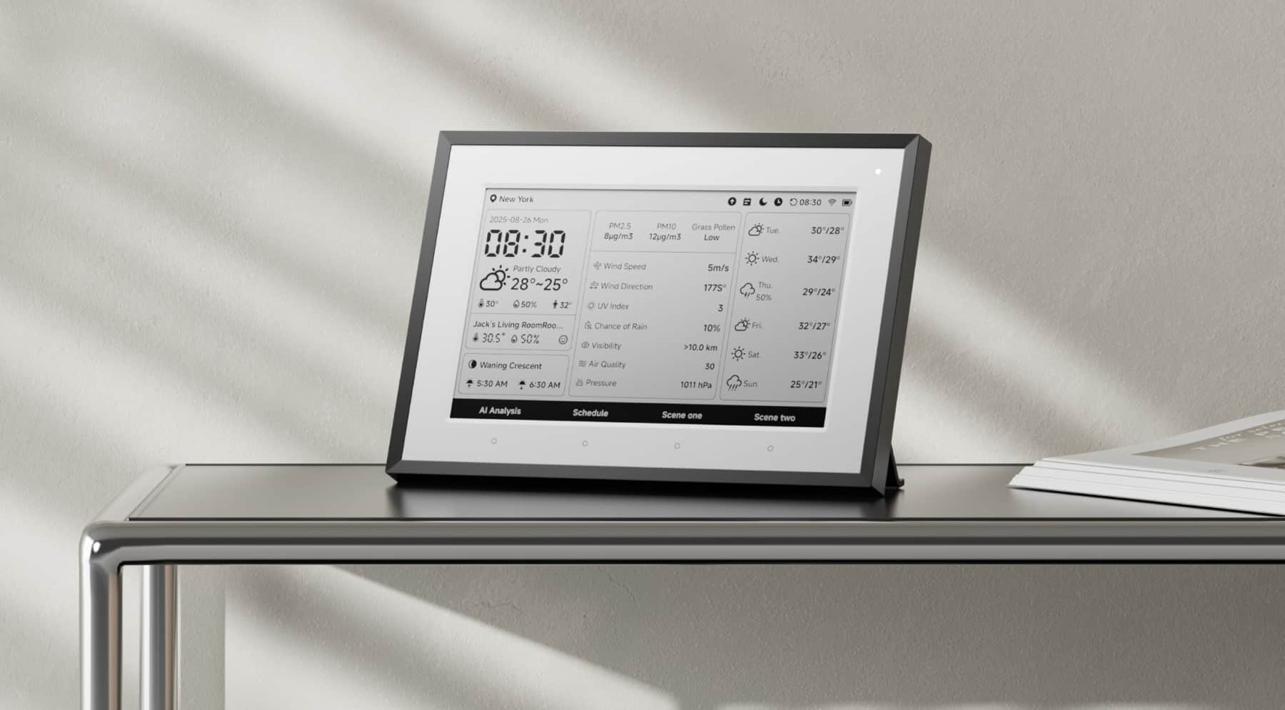 Auch für den Alltag zu Hause zeigt SwitchBot praktische Lösungen. Die neue Wetterstation bündelt mit einem 7,5-Zoll E-Ink-Display wichtige Informationen wie Wetter, Luftqualität, Temperatur, Luftfeuchtigkeit sowie eine 6-Tage-Vorhersage. Ergänzt wird das Ganze durch Kalender-Synchronisation, automatische Szenen und KI-basierte Wetter-Briefings mit Alltagsempfehlungen.