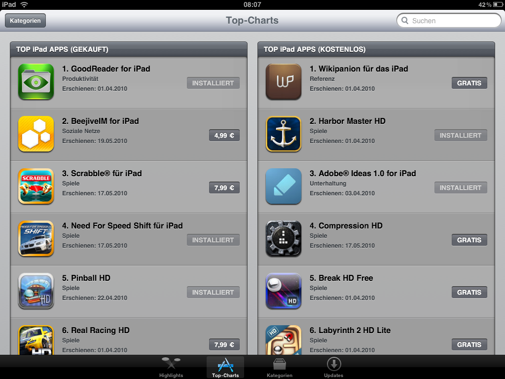Unter den Menüpunkten Top-Charts und Kategorien ist die Umstellung dagegen schon vollzogen. Hier wird alles ordentlich und so wie man es kennt dargestellt, man kann nach Lust und Laune shoppen gehen.