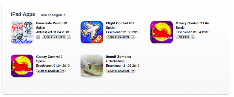 „Entwickler können sich auch dazu entscheiden, zwei getrennte Apps erstellen – dann muss man als Kunde zweimal zahlen, wenn man beide Versionen haben möchte“, so Blach. Ein Beispiel ist Flight Control: Die iPhone-Version kostet 79 Cent – wer vom großen Bildschirm des iPads profitieren will, muss sich jedoch die HD-Version kaufen – und in diesem Fall weitere 3,99 Euro bezahlen. Diese Apps tauchen im App Store in einem gesonderten Bereich auf (Screenshot 4).