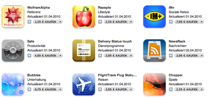 Wie von Apple schon auf der Keynote am 27. Januar angekündigt, laufen allen bisherigen Programme, die für das iPhone entwickelt wurden, auch auf dem iPad. Entweder in der Standard-Auflösung von 480 mal 320 Pixel und mit unschönen schwarzen Rändern oder interpoliert in doppelter Größte – sicher nicht optimal und nur eine Notlösung.