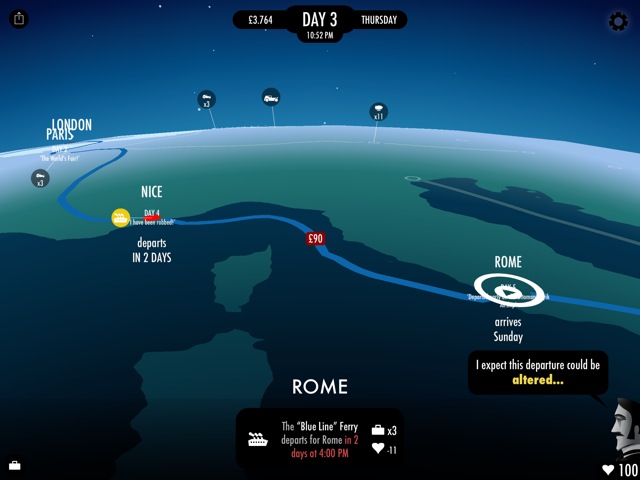80 Days: Das vorrangige Ziel von 80 Days ist es selbstverständlich, die Welt binnen 80 Tagen mit verschiedenen Verkehrsmitteln wie einem Heißluftballon, einem mechanischen Kamel, einem U-Boot oder einer Dampflok im Kampf gegen die Uhr zu bereisen. Auf einer 3D-Weltkarte heißt es, die sich stetig erweiternden Routen auszumachen und den besten Weg zu planen. Darüber hinaus gibt es die Möglichkeit, sich mit Menschen auszutauschen, Geld beim Kartenspiel zu gewinnen, oder auch zuvor erlangte oder gekaufte Gegenstände im eigenen Koffer gewinnbringend für die Reisekasse zu verkaufen. Ein tolles Abenteuer, das leider nur in englischer Sprache erhältlich ist. (Universal-App, 4,49 Euro, kompletter Bericht)