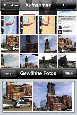 Hat man alle Fotos geschossen, öffnet man AutoStitch und wählt die einzelnen Bilder aus. Wenn man ähnliche Motive ausgewäht hat, muss man bei der Auswahl schon genauer hinsehen, aber viel kann man allerdings nicht falsch machen. Hat man alle Fotos ausgewählt, genügt ein Klick auf den Stitch-Button.